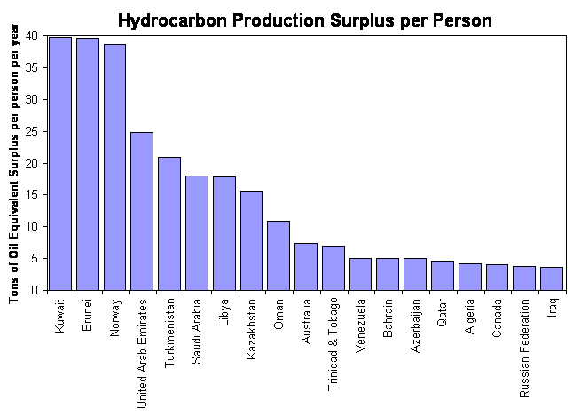 This Hydrocarbon Surplus/Deficit Index for each country is measured in tons of oil per person per year. The countries with the largest surplus per person essentially create the most net hydrocarbons per citizen of that country. The countries with the biggest deficit have to import these hydrocarbons from other countries.